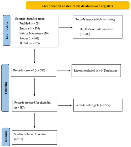 It was thus possible to verify that only 15 papers were matching the inclusion criteria [2,7,8,12,13,14,15,16,17,18,19,20,21,22,23]. The relevant PRISMA flow chart is detailed in Figure 7.