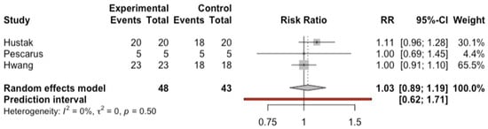 In the direct comparative analysis, technical success rates were compared based on the successful closure of the mucosotomy in the endoscopic clipping group and the suture group. The results indicated no statistical significance in the technical success rates of endoscopic clipping versus sutures (OR: 1.03; CI: 0.89 to 1.19; p = 0.50), as depicted in Figure 2, with a low heterogeneity measured with tau2 (0; CI: 0 to 0.12), I2 (0; CI:0 to 89.6%), and Q tests (1.4; df:2; p = 0.49). Additionally, the leave-one-out analysis did not show that any study significantly modified the effect size or heterogeneity.