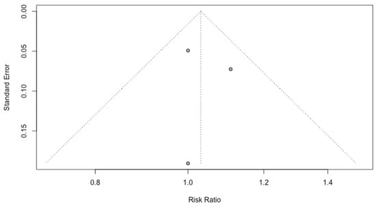 A total of three studies were evaluated using the Newcastle–Ottawa Scale for observational studies [14]. Funnel plots were created to assess publication bias; the funnel plots of the procedure success rates and time variables showed symmetry (Figure 6 and Figure 7), and the funnel plot of cost between interventions showed asymmetry (Figure 8). The Egger regression test to measure and possibly minimize publication bias was not possible due to the number of articles (<10 articles), but the leave-one-out and inference analyses showed that article number 1 was impacting the heterogeneity of the overall analysis, as shown in Figure 9 and Figure 10.