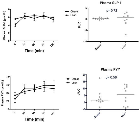 Basal plasma active GLP-1 and PYY concentrations were not significantly different between individuals with obesity and lean subjects (Figure 1). Neither were postprandial plasma PYY and GLP-1 levels significantly different between individuals with obesity and lean subjects. The incremental postprandial AUC for PYY and GLP-1 did not differ significantly between individuals with obesity and lean individuals (iAUC GLP-1 p = 0.25 and iAUC PYY p = 0.41).