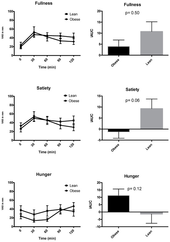 We expected to find differences in VAS scores of satiety between individuals with obesity and lean individuals. Studies investigating postprandial satiety/satiation responses in obesity have shown lower VAS scores of satiety/satiation compared to lean individuals. In another study by Debenedictis et al. [12], the investigators found no significant differences in VAS scores between the obese and lean individuals. However, a bias (e.g., giving socially desirable answers) cannot be ruled out.