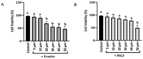 Determination toxic effects of erastin and RSL3. PANC1 cells were exposed to different doses of erastin (A) and RSL3 (B) for 24 h to assess the toxic effects of ferroptosis inducers. Data are means ± SEM, n = 8, independent measurements. Groups not sharing common letters are statistically different (p < 0.05), one-way ANOVA and Tukey’s post-hoc test.