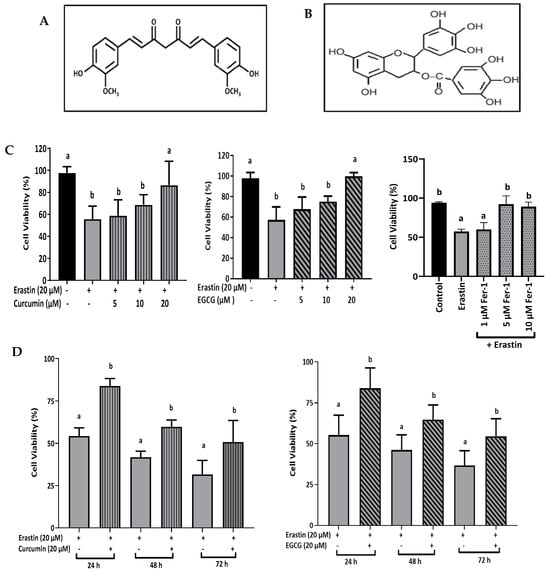 Anti−ferroptosis effects of curcumin and EGCG in PANC1 cells. Chemical structure of curcumin (A) and EGCG (B). PANC1 cells were supplemented with 20 μmol/L erastin for 24 h in the absence or presence of different doses of curcumin or EGCG or Fer-1. Curcumin and EGCG inhibited erastin-induced cell death in a dose- (C) and time- (D) dependent manner. Fer-1 indicated inhibitor effect against ferroptosis for 24 h. The percentage of cell viability is relative to control cell samples. Data are means ± SEM, n = 8, independent measurements. Groups not sharing common letters are statistically different (p < 0.05), one-way ANOVA and Tukey’s post-hoc test.