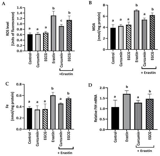 Effects of curcumin and EGCG on erastin-induced iron overloading, lipid peroxidation, and intracellular ROS production. PANC1 cells were treated with 20 μmol/L of erastin in the absence and presence of 20 μmol/L of curcumin or EGCG for 24 h. Then, Fe concentrations were measured by inductively coupled plasma mass spectrometry (ICP-MS) (A), The mRNA level FTH1 were analysed by qPCR (B), lipid peroxidation levels were determined by malondialdehyde (MDA) assay (C), cellular reactive oxygen species (ROS) were monitored with a dihydrodichlorofluorescein (H2DCF) cell-permeant probe (D). Data are means ± SEM, n = 3, independent measurements. Groups not sharing common letters are statistically different (p < 0.05), one-way ANOVA and Tukey’s post-hoc test.