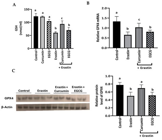 Anti-ferroptosis activity of curcumin in PANC1 cells against erastin-induced GSH depletion and GPX4 inactivity. PANC1 exocrine cells were treated with erastin (20 μmol/L) in the absence or presence of curcumin or EGCG (20 μmol/L) for 24 h. GSH levels (A) and indicated protein levels (B) and western blot (C), were determined by assay respectively. Data are means ± SEM, n = 3, independent measurements. Groups not sharing common letters are statistically different (p < 0.05), one-way ANOVA and Tukey’s post-hoc test.