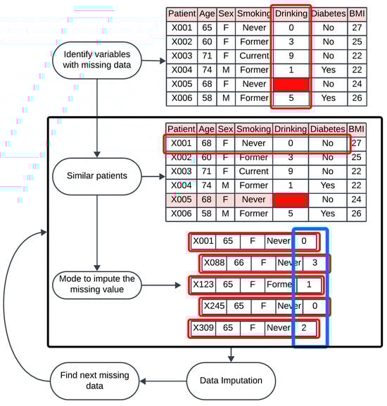 Step-by-step process of data imputation for categorical factors. The red squares highlight missing values and similar patients used for imputation, while the blue squares show the mode-imputed values. The arrows indicate the process of identifying, selecting, and filling missing data using similar patient records.