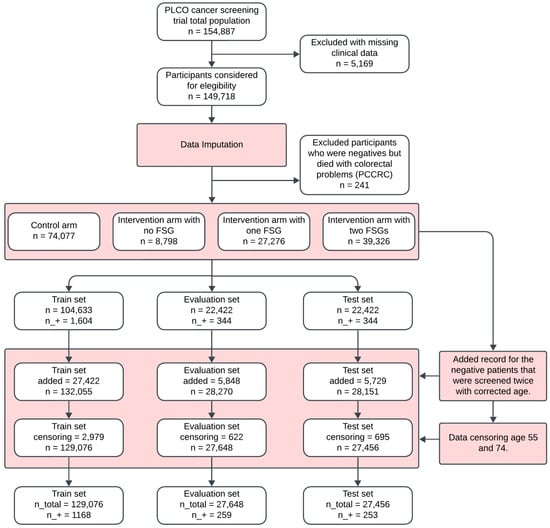 Following data imputation, an additional 241 cases were removed, as they were negative cases who later died from post-colonoscopy colorectal cancer (PCCRC). The final eligible participants consisted of 149,718 individuals, who were divided into the following four groups: 74,077 (49.5%) in the control arm, 8798 (5.9%) in the intervention arm with no flexible sigmoidoscopy (FSG), 27,276 (18.2%) in the intervention arm with one FSG, and 39,326 (26.3%) in the intervention arm with two FSGs. These groups were further split into training, evaluation, and test sets (Figure 3).