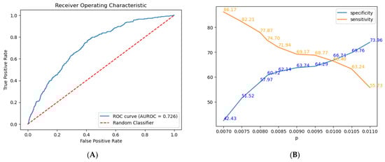 Figure 4B shows the trade-off between specificity and sensitivity at various probability thresholds (p) for our model. Specifically, we evaluated predictions across a range of thresholds, selecting a specific threshold for analysis. As p increases from 0.007 to 0.011, specificity improves from 42.43% to 73.96%, while sensitivity decreases from 86.17% to 55.73%.