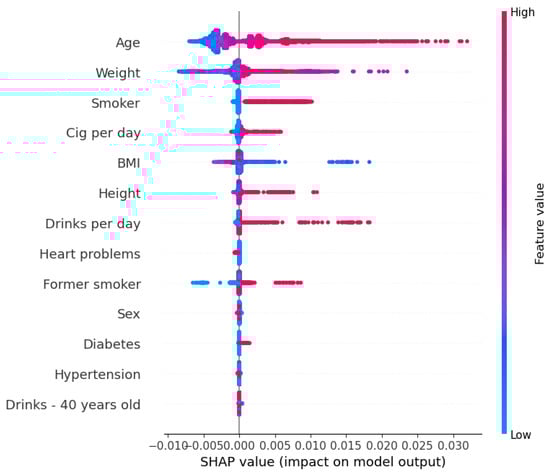 Figure 5 displays the contribution of each factor to the CRC risk prediction model, utilizing SHAP. Factors are ordered along the y-axis based on their significance in the model’s predictions. SHAP quantifies the impact of each factor on an individual’s prediction, with positive values indicating an increased risk of CRC and negative values indicating a decreased risk.