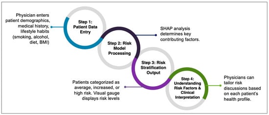 In recent years, advances in colorectal cancer (CRC) screening have contributed to a significant decrease in mortality, mainly through the early detection and removal of precancerous lesions [,]. However, CRC remains a global burden, standing as the third most commonly diagnosed malignancy and the second leading cause of cancer-related deaths worldwide, accounting for roughly 10 of all cancer cases. Many well-established screening guidelines have played a role in improving outcomes, yet these recommendations typically rely on generalized, age-based recommendations, advising average-risk individuals to begin screening at age 50 [,]. This one-size-fits-all approach does not account for individual variability in risk factors such as genetics, lifestyle, and family history, potentially leading to suboptimal screening outcomes, nor does it offer a straightforward means for clinicians to discuss personalized risks with patients.