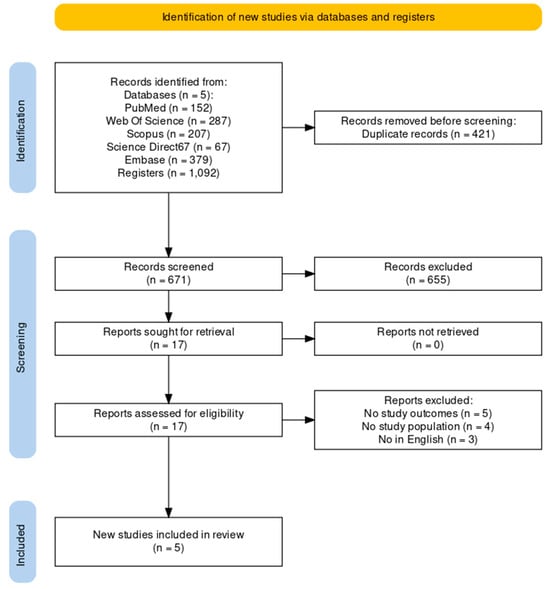 The initial search across four databases retrieved a total of 1092 records, of which 421 were identified as duplicates and subsequently removed. Screening of the remaining 671 titles and abstracts led to the selection of 17 studies for full-text evaluation based on predefined inclusion and exclusion criteria. After a comprehensive assessment, data extraction was performed from five eligible English-language articles. The study selection process, along with the reasons for exclusion, is depicted in the PRISMA flowchart (Figure 1), generated using the online tool by Haddaway et al. [].