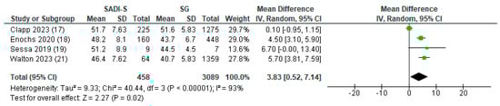 We evaluated the mean difference in BMI among 3547 patients who underwent SADI-S (n = 458, 12.91%) or SG (n = 3089, 87.88%), resulting in patients undergoing SADI-S having a higher BMI than those undergoing SG (MD = 3.83, 95% CI = 0.52–7.14, p = 0.02) (Figure 3).