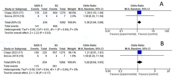 A pooled odds ratio analysis was conducted for obesity-related comorbidities among 1516 patients, including 234 (15.43%) who underwent SADI-S and 1282 (84.56%) who underwent SG. Hypertension and obstructive sleep apnea (OSA) were the only conditions consistently reported across multiple studies. The analysis revealed that patients undergoing SADI-S had a significantly higher likelihood of hypertension compared to those undergoing SG (OR = 1.38, 95% CI = 1.04–1.84, p = 0.03) (Figure 4A). However, no significant association was observed between the surgical procedure and OSA prevalence (OR = 1.22, 95% CI = 0.92–1.61, p = 0.17) (Figure 4B).