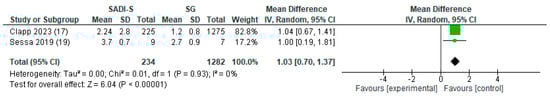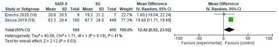 We evaluated the mean difference in LOS among 624 patients who underwent SADI-S (n = 169, 27.08%) or SG (n = 455, 72.91%), resulting in patients undergoing SADI-S having a higher %EWL with an MD of 12.42% (95% CI = 0.92–23.92, p = 0.03) at 12 months (Figure 8).