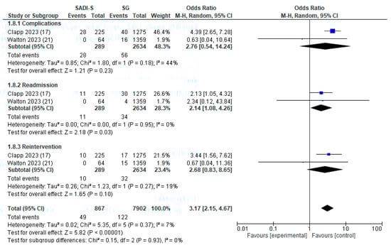 We evaluated the pooled odds ratio (OR) for postoperative events in the first 30 days postoperative, including complications, readmission, and reoperation. A total of 2923 patients who underwent either SADI-S (n = 289, 9.88%) or SG (n = 2634, 90.11%) were included. Our analysis revealed that patients undergoing SADI-S faced a significantly higher risk of postoperative events compared to those who underwent SG (OR = 3.17, 95% CI = 2.15–4.67, p < 0.001) (Figure 7). However, subgroup analysis indicated that this elevated risk was statistically significant only for readmission, with SADI-S patients demonstrating a greater likelihood of readmission compared to SG patients (OR = 2.14, 95% CI = 1.08–4.26).