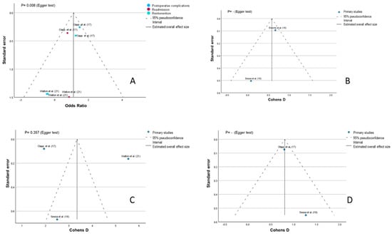 Publication bias was evaluated through visual inspection of funnel plots to assess the symmetry of trial distributions, supplemented by Egger’s test. An asymmetrical funnel plot combined with a p-value < 0.1 on Egger’s test was considered indicative of publication bias [].