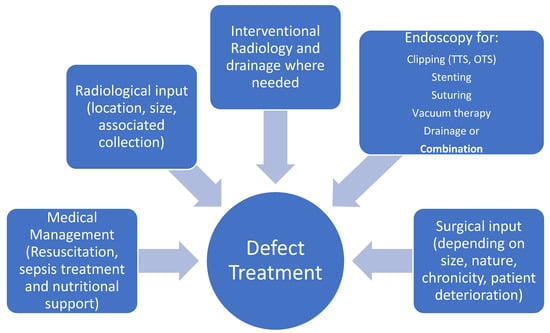 When endoscopic intervention is considered, there are several options available for closure []. The theoretical benefit of all available devices that can anchor the GI tract layers promoted research on their applicability for defects by hypothesizing that bringing the margins closer could resolve defects. In this regard, through-the-scope (TTS) and over-the-scope clips (OTSC) and their combination with endoloops have been used. Furthermore, using fully covered stents to seal the defect’s area is also a reasonable solution, depending on the site of the defect. In this way, perforations, leaks, and fistulae have been managed using endoscopic measures. The European Society of Gastroenterology (ESGE) and the American Gastroenterological Association (AGA) recommend management with TTS clips for small perforations (<10 mm), OTSC for those >10 mm, and stenting for larger ones where applicable [,]. However, all the above-mentioned techniques are not always effective, and defect’s management remains challenging and affected by various factors, independent of the endoscopic technique []. Recently, the use of endoscopic vacuum therapy attached to a metal stent has been proposed and has demonstrated encouraging results in the treatment of esophageal leaks [,]. The variety of choices in the absence of clear evidence requires a multimodal approach involving endoscopists, surgeons, and radiologists in order to plan the optimal strategy and decide the best therapeutic plan, combining closure, drainage, and medical treatment, as indicated in [,] (Figure 1).