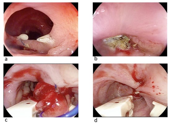 Endoscopic suturing (ES) is a minimally invasive technique for deploying full thickness sutures in the GI tract []. Although it was initially introduced in clinical practice as a method to perform bariatric interventions [], the current range of indications has become broader, including defect closure following endoscopic full-thickness resection [,], post-operative leaks [], fistula closure [], perforation repair [], stent fixation [], closure following endoscopic resection [,], and treatment of large bleeding ulcers, in addition with other techniques, such as hemostatic powders [,]. (Figure 2, Figure 3 and Figure 4 ES can be used for large defects with irregular margins or complex defects where endoscopic clipping would not be feasible. Furthermore, the full thickness nature of the closure yields greater tissue approximation than other closure techniques.