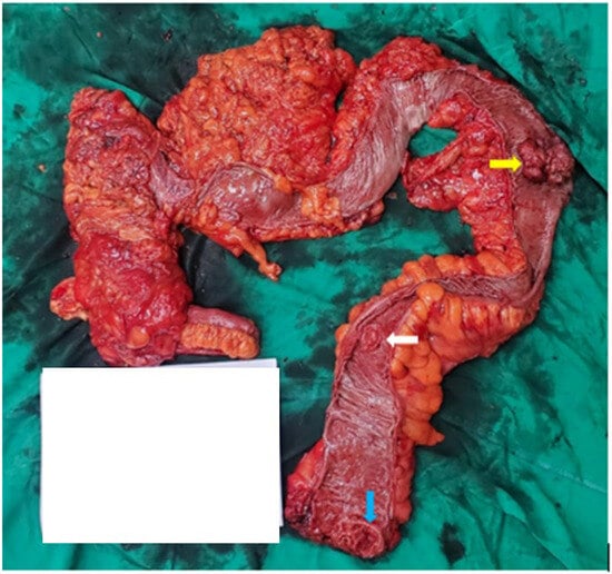 Macroscopic lesions: splenic flexure adenocarcinoma (yellow arrow), sigmoid colon adenocarcinoma (white arrow), and rectal adenocarcinoma (blue arrow). The white rectangle indicates individual notes for the patient during operation.