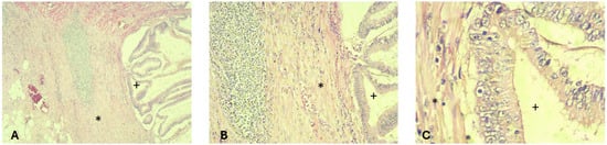 Histopathological examination of the rectal lesion reveals a poorly differentiated adenocarcinoma (represented by the plus symbol) that invaded the subserosal layer (represented by the asterisk symbol). (A) Magnification ×40; (B) magnification ×100; (C) magnification ×400.