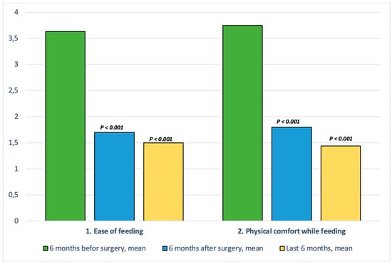 Daily Care and Overall Condition of the Child. Section A of the questionnaire explores parental attitudes toward daily care of the child and the child’s overall condition. Parents reported improvements in ease of feeding and physical comfort while feeding, both 6 months following surgery and in the last 6 months (all p values ≤ 0.001). The mean ease of feeding improved from 3.63 (average to poor) before surgery to 1.69 and 1.50 (good to excellent) 6 months after surgery and in the last 6 months, respectively. A total of 73% of parents reported excellent feeding conditions in the last 6 months. The comfort of the child (p ≤ 0.001), their ability to enjoy life (p = 0.003), and the child’s developmental progress (p ≤ 0.001) showed improvements when comparing the periods before and after surgery and in the last 6 months. Improvements were also reported in the comfort of the child (p ≤ 0.001), their ability to enjoy life (p = 0.003), and the child’s developmental progress (p ≤ 0.001) when comparing the periods before surgery and after surgery, with more improvements reported in the last 6 months (Figure 1 and Figure 2).