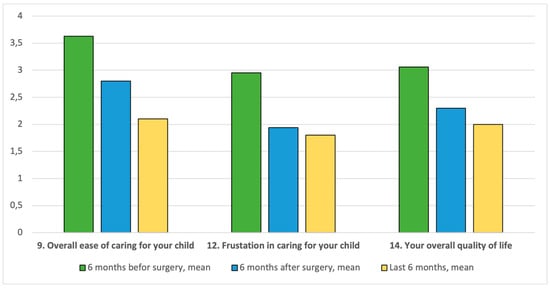 Comparison of the “quality-of-life” domain across the three study timepoints. A marked improvement is observed in caregivers’ perception of the ease of caring for their child, levels of frustration, and overall caregiver quality of life.