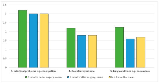 The lack of improvement in intestinal problems, such as treating constipation, is consistent with what was reported in a similar study from 2010, as well as in the original O’Neill study [,]. The p values were 0.74 and 0.64 for pre- vs. post-surgery and pre-surgery vs. last 6 months, respectively. A possible explanation for this absence of change is that constipation may be due to SNI-induced dysmotility, an abnormality that is not corrected by fundoplication.