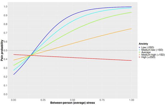 Predicted pain probabilities as a function of between-person (average) stress for different typical anxiety levels. Lines represent estimated probabilities from a logistic regression model at five anxiety levels (−2 SD, −1 SD, mean, +1 SD, and +2 SD). The dotted horizontal line indicates a 50% probability of pain.