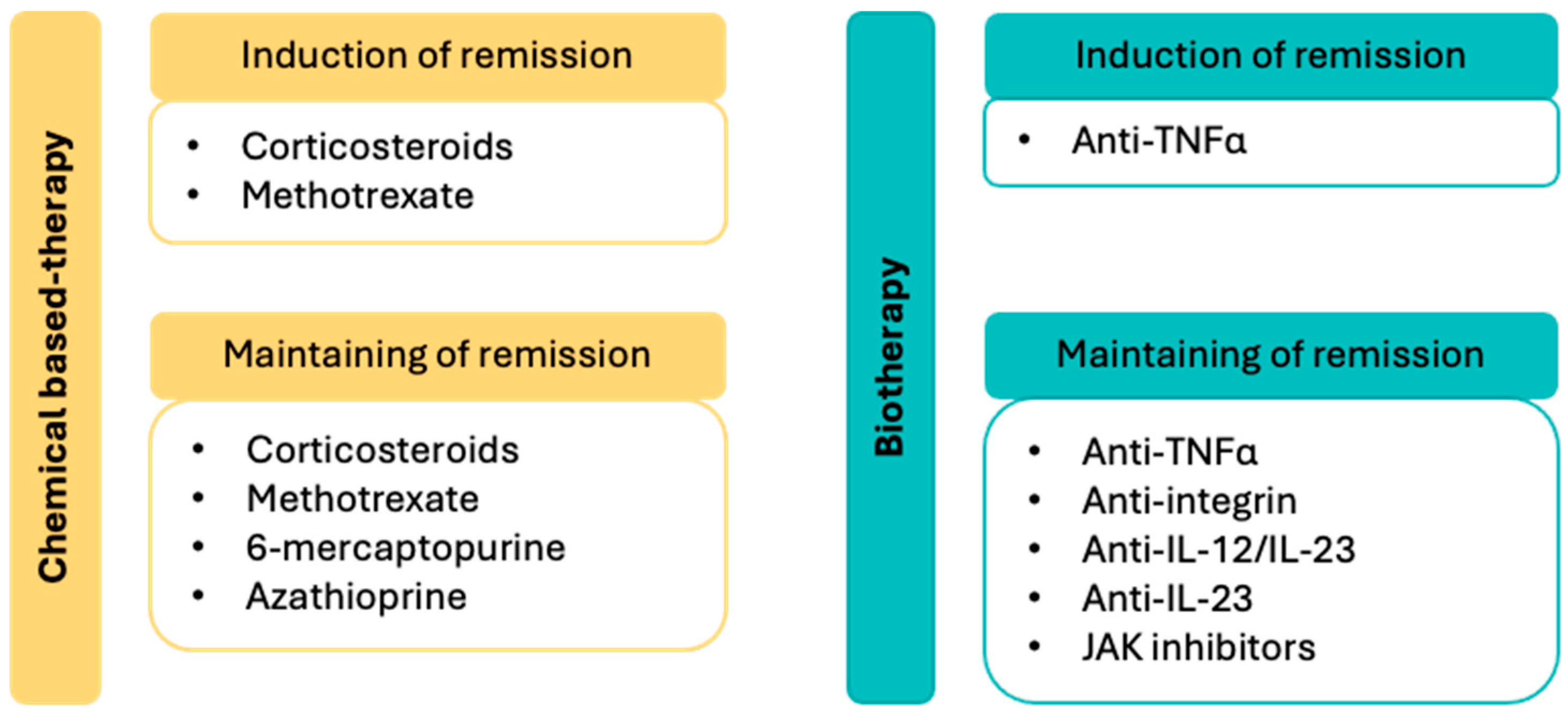 - Torres, J.; Bonovas, S.; Doherty, G.; Kucharzik, T.; Gisbert, J.P.; Raine, T.; Adamina, M.; Armuzzi, A.; Bachmann, O.; Bager, P.; et al. ECCO Guidelines on Therapeutics in Crohn’s Disease: Medical Treatment. J. Crohn’s Colitis 2020, 14, 4–22. [Google Scholar] [CrossRef]