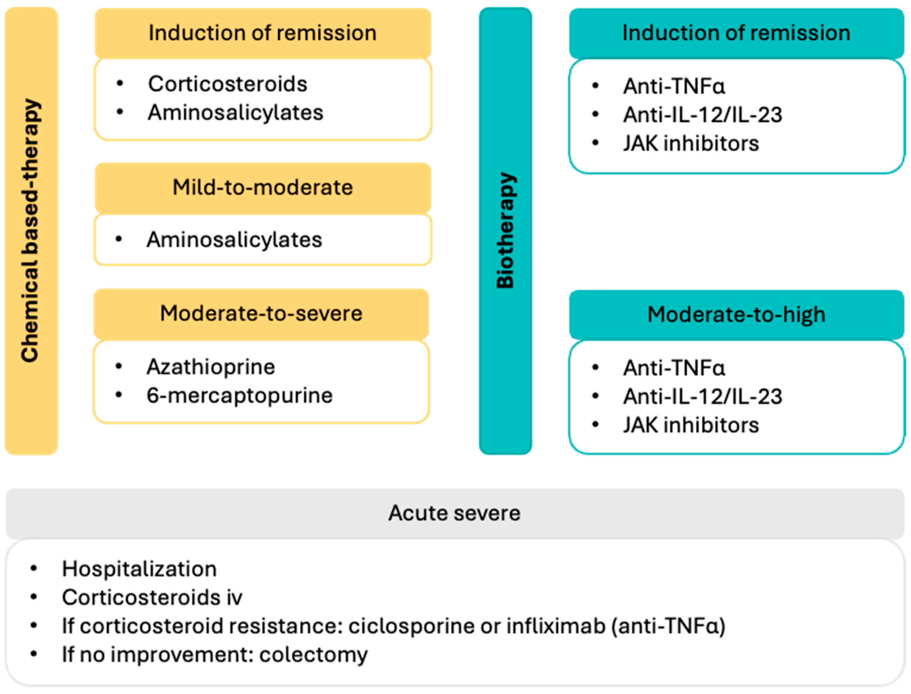 45]. The classification of ulcerative colitis is based on symptom severity: mild-to-moderate, moderate-to-severe, and acute severe [