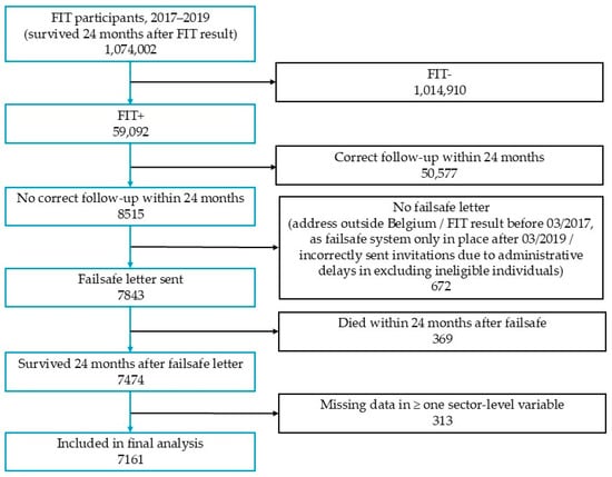 The study population included all screening episodes with a FIT+ result during 2017–2019, in which individuals did not have a correct follow-up within 24 months after the FIT+ result and thus received a failsafe letter. These individuals were followed up for 24 months after receiving the failsafe letter to assess whether a correct follow-up occurred within that period. Those who died within 24 months after receiving the failsafe letter (369) were excluded leaving 7474 eligible participants. Finally, 313 records were excluded due to missingness in at least one sector-level variable (see Section 4.4.1), resulting in 7161 screening episodes included in the final analysis.