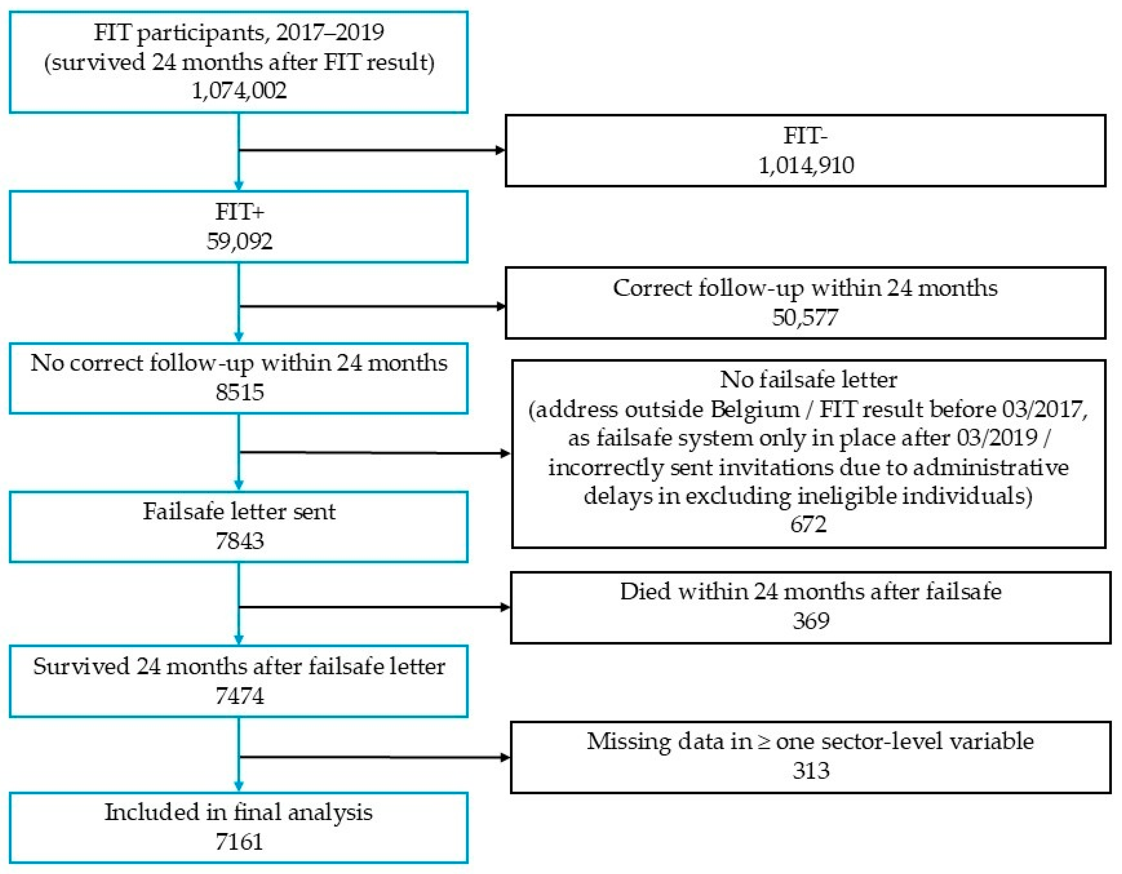 - Hoeck, S.; De Schutter, H.; Van Hal, G. Why do participants in the Flemish colorectal cancer screening program not undergo a diagnostic colonoscopy after a positive fecal immunochemical test? Acta Clin. Belg. 2021, 77, 760–766. [Google Scholar] [CrossRef]