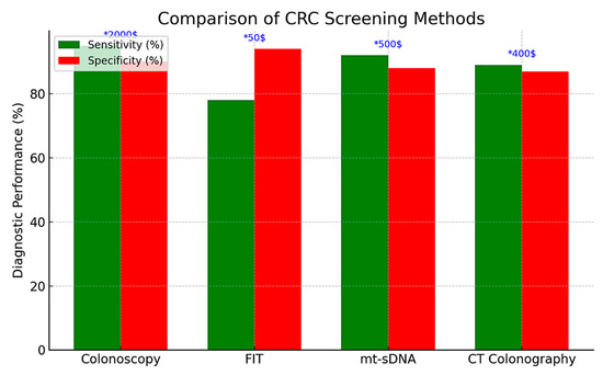 Comparison between potential screening methods for CRC * [63,64,65,66,67]. (* All prices listed in the table reflect estimates based on costs in the United States. Actual costs may vary in other countries depending on healthcare systems, insurance coverage, and local pricing policies).