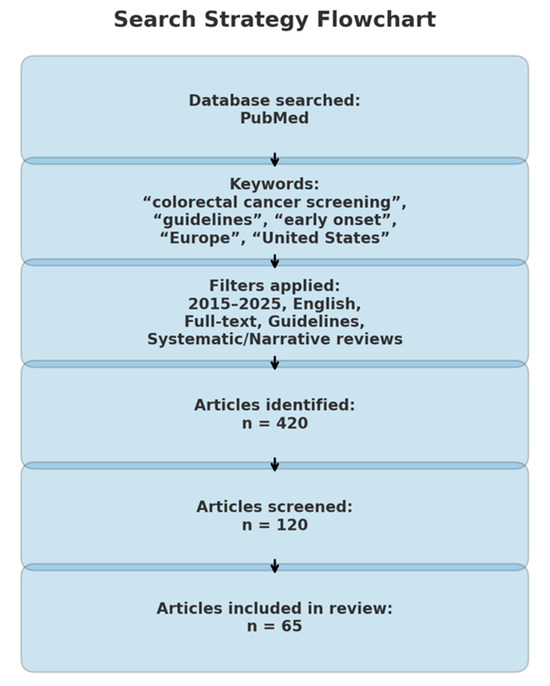This paper is a descriptive, narrative review that explores CRC screening strategies in both Europe and the United States, synthesizing evidence that may highlight the need for adaptation in current screening practices. A comprehensive search of the medical literature was conducted using the PubMed database for the period 2015–2025, targeting articles published within the past decade. The search strategy employed a combination of relevant keywords, including: “CRC screening,” “guidelines,” “early onset,” “late onset,” “Europe,” “United States,” “recommendations,” “age 45,” and “age 50” (Figure 2).