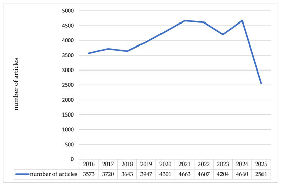 Evaluation of publication trends over the last decade (2016–August 2025) indicates a growing interest in the subject. Between 2016 and 2020, publications numbered under 4000 per year, showing a gradual upward trajectory. Since 2020, annual publications exceeded 4000, following an upward trend, with a slight decline in 2023 (Figure 1).