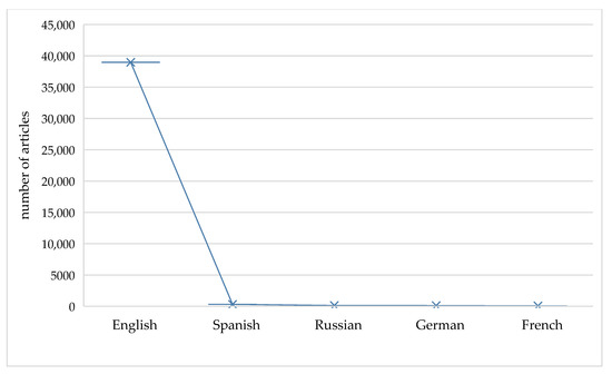 The vast majority of articles were published in English (38,964 articles, Figure 2).