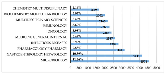 The top 10 subject areas are summarized in Figure 3. Approximately 30% of articles fall into Microbiology, Gastroenterology And Hepatology, and Pharmacology And Pharmacy.