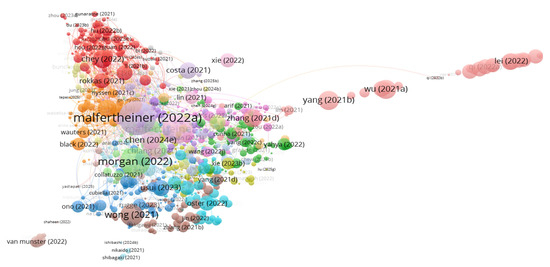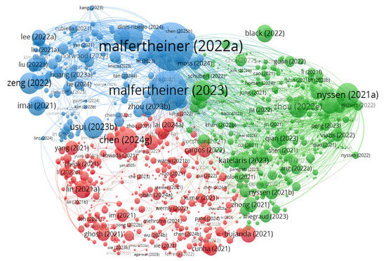 The “bibliographic coupling” relationship between documents is a method of analyzing the connections between scientific papers based on their common references. Essentially, two documents are considered bibliographically coupled if they cite the same set of sources or have common references. The bibliographic coupling relationship in VOSviewer provides an analysis of the conceptualization, influence, and thematic relationships between documents, based on common references. This provides insight into the structure and evolution of a research field, which is useful for identifying thematic clusters and main research topics in a given body of literature. Three clusters were identified (Figure 6). The red cluster consists of 452 articles and has Chen at its center, while the blue cluster includes two of Malfertheiner’s most cited articles; however, it contains the smallest number of articles (n = 195).