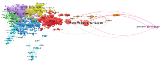 Of 107,346 identified authors, 2209 had at least five articles. Table 2 summarizes the top 10 authors by publication volume. Analysis of the data in Table 2 suggests that, in terms of productivity (number of articles published), first place is occupied by P. Malfertheiner (n = 29), followed by F. Megraund (n = 27), J.P. Gisbert (n = 21), S. Seurbaum (n = 16), C. Schulz, and M.C. Camargo (n= 19). The most citations are associated with the publications of Malfertheiner (n = 1877), Megraund (n = 1785), and Liou (n = 1463). Based on the average citations per document, the authors are ranked as follows: A. Gasbarrini (n = 119.22) and J.-M. Liou (n = 112.53). In terms of network connectivity (TLS), the highest value is held by F. Megraund (n = 2645), followed by P. Malfertheiner (n = 2505) and Liou (n = 1958).
