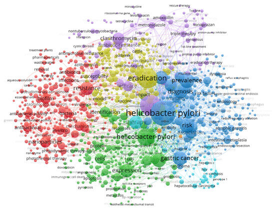 As for keywords, 57,462 words were identified; of these, 5292 were encountered at least five times. The most frequent keyword was “helicobacter pylori,” followed by “infection” and “eradication.” The map reflecting the frequency of occurrence of keywords is shown in Figure 8.