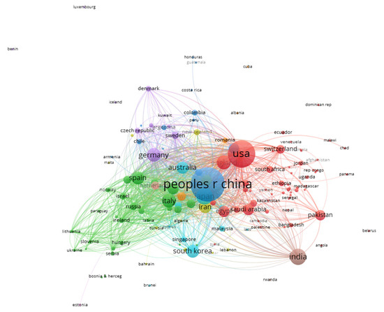 The third important hub (blue), consisting of 13 countries, includes the most important contributor, namely the People’s Republic of China, which plays an essential role in interconnecting the scientific community.