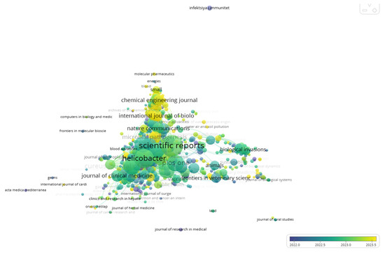 Journals with a high volume of articles and citations, such as SCIENTIFIC REPORTS and HELICOBACTER, are more productive and have high TLS, indicating strong network connectivity (Table 3). The highest TLS values are associated with HELICOBACTER (593,177), SCIENTIFIC REPORTS (544,086), CUREUS (535,809), and PLOS ONE (462,524), indicating strong network connectivity. FRONTIERS IN IMMUNOLOGY and ANTIBIOTICS-BASEL have the highest average citation values per article (8.56 and 8.47, respectively).
