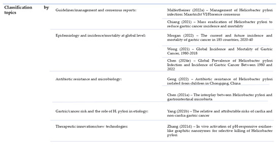 Articles can be categorized into several themes (guidelines/consensus, epidemiology, cancer risks, etc.) with implications for clinical practice (Figure 11). The essential articles provide the theoretical basis, clinical guidelines, and critical epidemiological data for understanding and controlling H. pylori infection, which are indispensable for guiding treatment and prevention strategies. Articles published by Malfertheiner (2022a) [15] and Chiang (2021) [23] provide standardized recommendations and clinical guidelines, which are fundamental to medical practice. Articles providing data on epidemiology, global incidence/mortality {(Morgan (2022) [17], Wong (2021) [19], and Chen (2024e) [22]} and the role of H. pylori in the etiology and risk of gastric cancer Yang (2021b) [21] can also be considered essential articles.