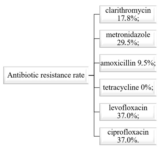 Antibiotic resistance mapping performed by J.H. Lee [39], which included 590 adult subjects and 580 biopsy tissues, supports a variation in response depending on the geographical area. The culture success rate was over 60%. The antibiotic resistance rate (determined by the agar dilution method) is shown in Figure 12.