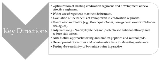 - Boyanova, L.; Hadzhiyski, P.; Kandilarov, N.; Markovska, R.; Mitov, I. Multidrug resistance inHelicobacter pylori: Current state and future directions. Expert Rev. Clin. Pharmacol. 2019, 12, 909–915. [Google Scholar] [CrossRef] [PubMed]