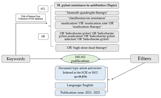 The following query was used: ALL: ‘H. pylori resistance to antibiotics’ (Topic) OR ‘bismuth quadruple therapy’ OR ‘clarithromycin resistance’ OR ‘eradication’ OR ‘eradication rate’ OR ‘eradication therapy’ OR ‘gastritis’ OR ‘h pylori’ OR ‘helicobacter pylori’ OR ‘helicobacter pylori eradication’ OR ‘helicobacter pylori infection’ OR ‘helicobacter-pylori’ OR ‘high-dose dual therapy’ OR ‘italic helicobacter pylori italic’ OR ‘quadruple therapy’. The Boolean operator OR was applied to broaden the search, including synonyms and related terms.