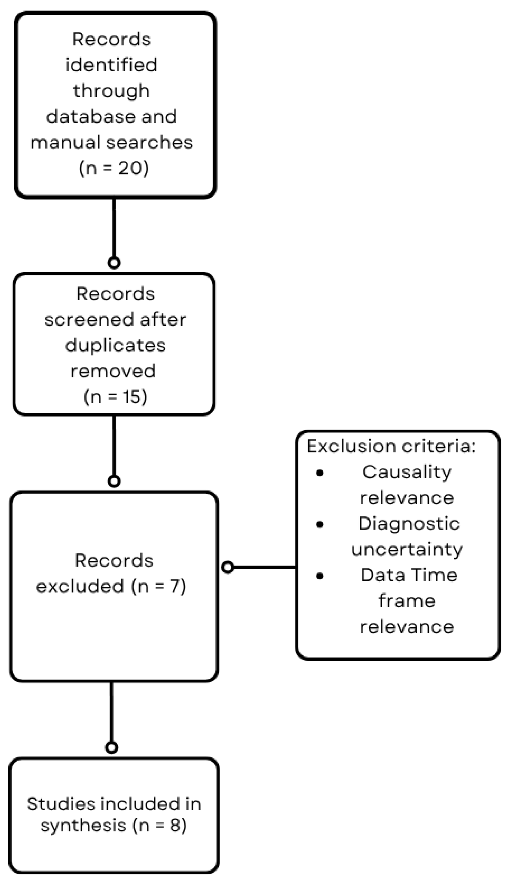 A comprehensive literature search was conducted to identify reports and studies linking varicose veins and malignancies, with particular focus on gastric cancer (Figure 1). The search was performed using the PubMed, Scopus, and Web of Science databases covering the last 13 years. Search terms included combinations of keywords and Medical Subject Headings (MeSH) such as “varicose veins,” “venous insufficiency,” “bilateral varicosities,” “gastric cancer,” “malignancy,” “tumor compression,” and “paraneoplastic syndrome.” Boolean operators (AND, OR) were used to refine the search. Articles were screened by title and abstract for relevance, followed by full-text review. Inclusion criteria comprised case reports, case series, observational studies, and reviews reporting on the association of varicose veins or venous abnormalities with malignancy. Studies lacking sufficient clinical or diagnostic details, lack of direct association between venous changes and malignancy and studies outside the defined period were excluded.
