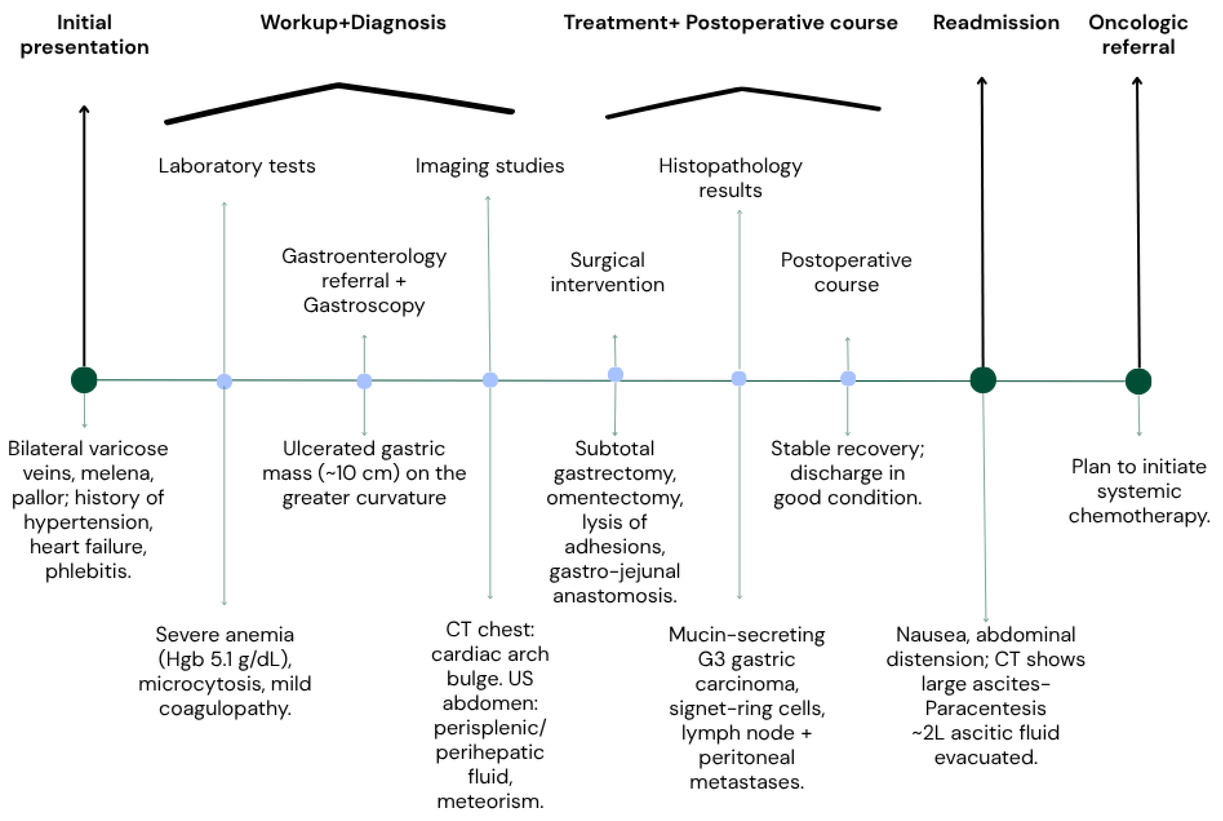 This case discussion and review have several limitations. Bilateral varicose veins as a presenting symptom of gastric cancer are infrequent, so current literature consists largely of solitary-case series and small series, excluding the strength of evidence and generalizability. The literature review may have lacked unpublished research or research published in foreign languages. In addition, reporting standards heterogeneity among case reports renders synthesis and direct comparison challenging. Finally, causality between malignancy and varicose veins is speculative in the majority of the studies since there are no prospective studies. This highlights the need for larger, systematic studies to clarify further the relationship and clinical significance of venous manifestations in cancer.
