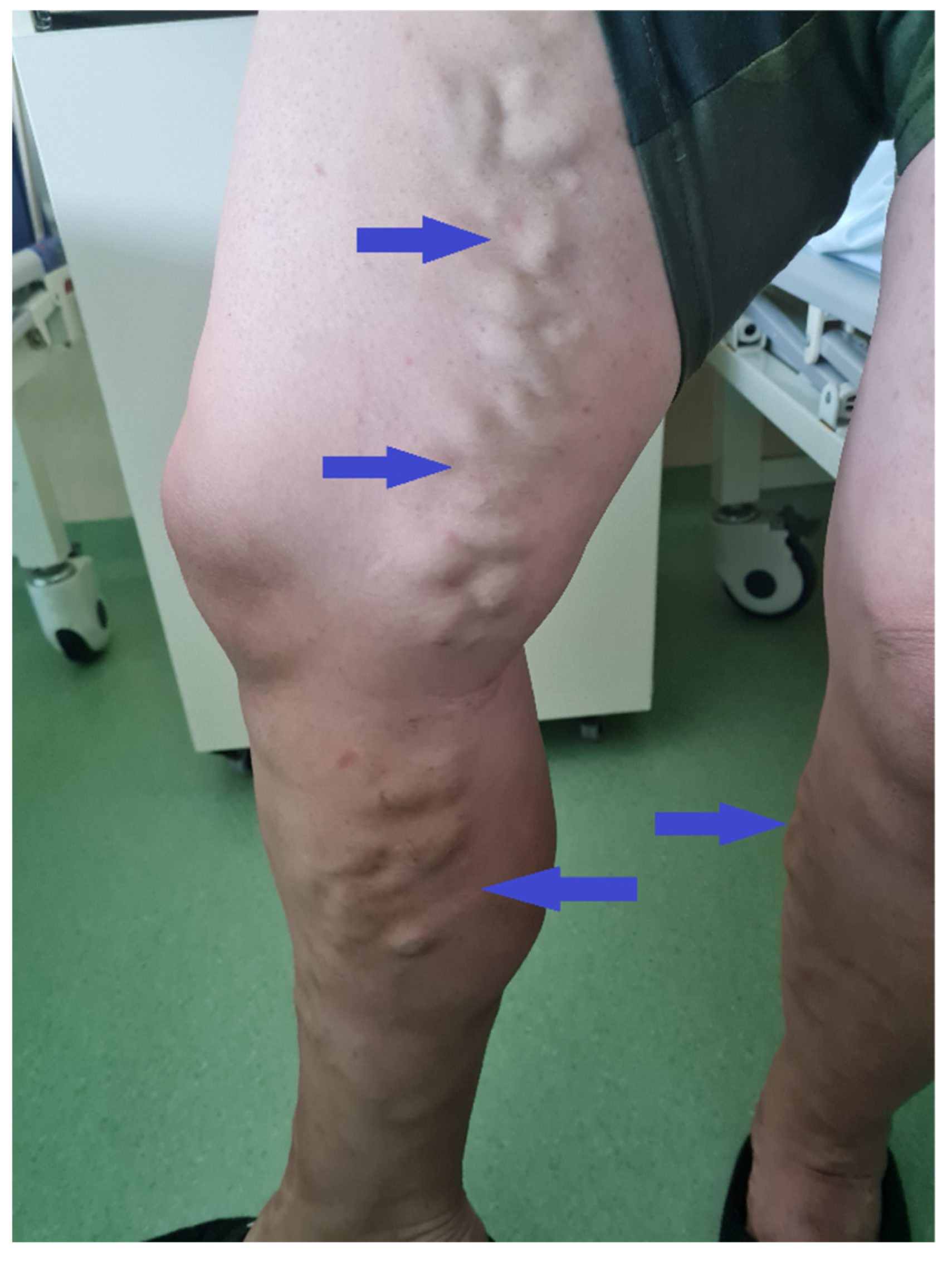 - Antani, M.R.; Dattilo, J.B. Varicose Veins. In StatPearls [Internet]; StatPearls Publishing: Treasure Island, FL, USA, 2025. Available online: https://www.ncbi.nlm.nih.gov/books/NBK470194/ (accessed on 10 July 2025).