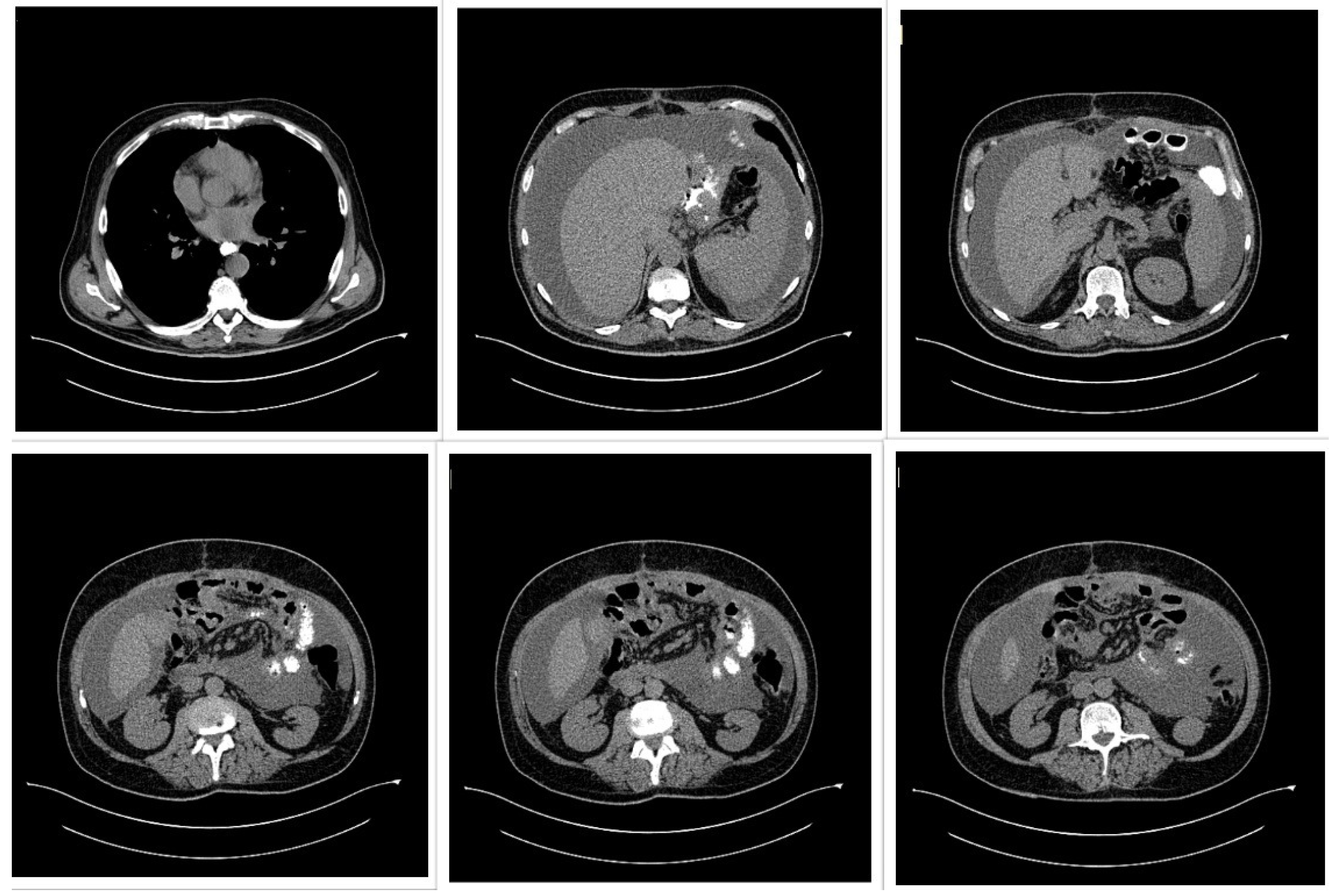 A 50-year-old male patient (Figure 2) with associated pathologies (arterial hypertension, mitral insufficiency, heart failure NYHA grade II, chronic venous insufficiency, and history of superficial phlebitis on the lower limbs) was admitted in the hospital clinically presenting varicose veins, with sinuous and dilated aspect, bilaterally compressible (Figure 3), at the level of the lower limbs, and pale tegument. Paraclinically, the following blood tests were requested: the biochemical profile, coagulation tests and complete blood count, from which the most critical findings were the following parameters: Quick time 73% (WRR. 190–148%), prothrombin 14.3 s (9.4–12.5 s), fibrinogen 400 mg/dL (200–393 mg/dL), hemoglobin 5.1 g/dL (13.6–17.2 g/dL), lymphocytes’ number 0.6 × 101/miL (0.8–3.8 × 101/mi) and lymphocytes percentage 12.2% (20–40%), red blood cells’ number 3.08 × 106/miL (4.5–5.9 × 106/miL), hematocrit 18.7% (39–51%), erythrocyte volume 60.6 fl (80–100 fl) and RDW-CV 17.2% (11.6–14%). Increased attention was paid to the severe anemia (Hb = 5.1 g/dL) detected, after which a gastroenterological consultation was requested, the gastroscopy revealing a proliferative ulcerated process over the greater curvature of the stomach, with an approximate dimension of 10 cm. In the meantime, a thoracic CT and abdominal ultrasound were performed as well (Figure 4): the chest CT revealed a bulge of the right lower cardiac arch and pulmonary hilum increased in volume, without processes of pulmonary condensation. In contrast, the abdominal ultrasound showed marked meteorism and a thin layer of perisplenic and perihepatic fluid. In light of paraclinical and clinical findings, it was then decided to intervene surgically, and during the procedure, a voluminous gastric neoplasm was found, invading the transverse colon, together with peritoneal carcinomatosis, parietal invasion, and neoplastic ascites. Therefore, the surgical team decided to practice subtotal gastrectomy, HoffmeisterFinsterer gastro-jejunal anastomosis, omentectomy, lysis of adhesions and subhepatic drainage. Two specimens were collected: a gastric tumor with epiploon and a second one with the peritoneal carcinomatosis, and eventually the histopathological examination came to the diagnosis of a muco-secreting gastric carcinoma, diffused, with cells in “seal ring”, mildly differentiated G3 with lymph node and peritoneal metastasis. Postoperatively, antibiotic and analgesic treatment, TEP and DVT prophylaxis, toilet and wound dressing were instituted, with favorable evolution and suppression of the drain tube and suture threads. Finally, the patient was discharged with a good general condition, presenting appetite, afebrile, present T.I, considered surgically cured, with the recommendation of an oncological consultation and a second check-up at 30 days apart. Indeed, a month later, the patient was again admitted to the hospital, presenting with nausea, loss of appetite and abdominal distention; therefore, an abdominal and pelvic CT-scan with contrast media was requested as a paraclinical investigation. The scan confirmed a good functioning of the gastroenteric anastomosis performed in the previous operation, but a large perihepatic and perisplenic ascites between intestinal loops and bilateral parieto-colic was found, and for this reason a paracentesis was decided to perform, via which approximately two liters of ascitic fluid was evacuated. The patient was then referred to oncology, in order to initiate the appropriate chemotherapeutic treatment and discharged with improved general conditions.